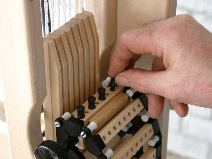 • Mechanischer Dobby: Hier programmieren Sie die Schaftkombinationen mithilfe von nummerierten Löchern auf Programmleisten und kleinen Stiften.