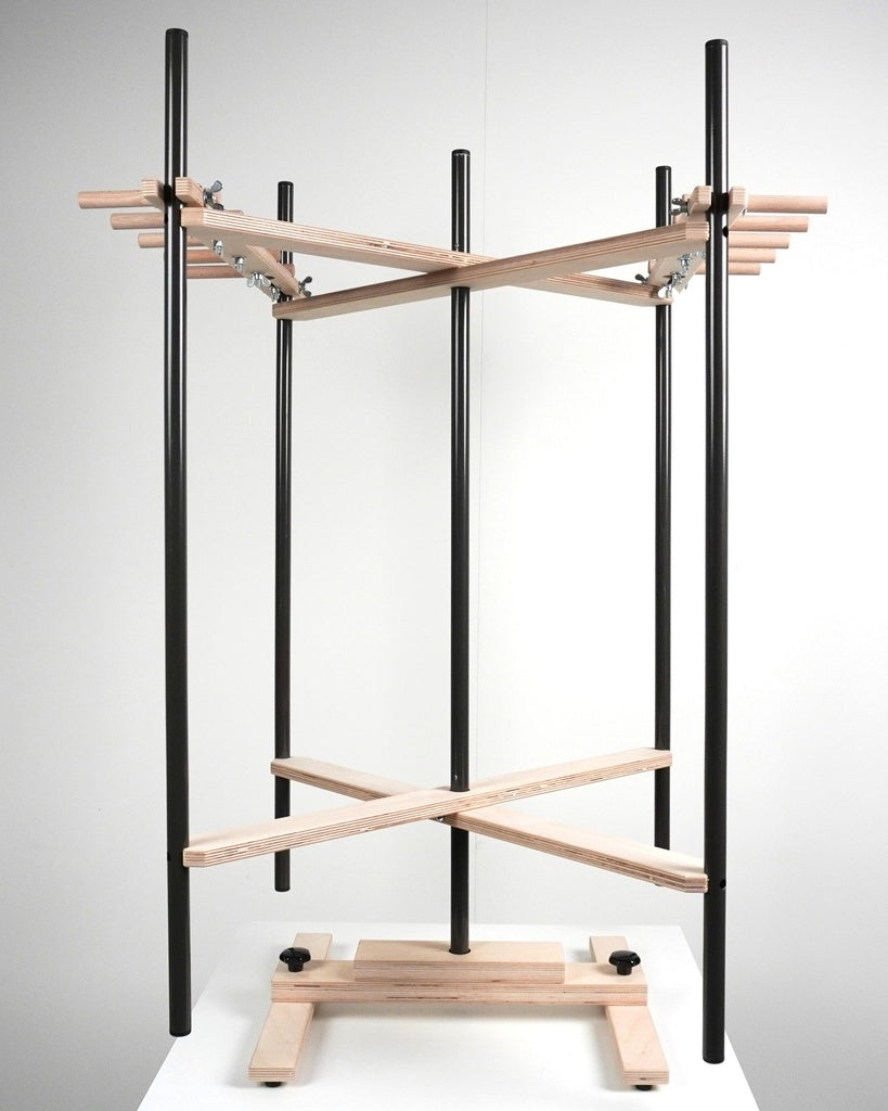 Zusätzlich eignet sich der Schärbaum als Garnhaspel, um handgesponnene Garne gleichmäßig zu trocknen. Hergestellt aus unlackiertem Birken-Sperrholz und Metallrohren, ist er stabil und kann zur platzsparenden Aufbewahrung flach zusammengeklappt werden.