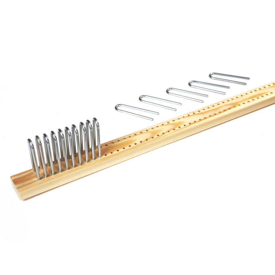 Ein Zahnkamm, oft auch Halbwebkamm genannt, ist ein praktisches Werkzeug zum Schären, besonders in Kombination mit einem Nestkamm am Anschlagtisch. Durch den eingelegten Holzstreifen bleiben die Schärfäden sicher an ihrem Platz und lassen sich gleichmäßig vorbereiten. Ideal für alle, die beim Schären präzise und zuverlässig arbeiten möchten.